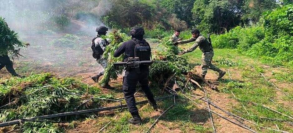 En labores conjuntas, elementos de la Secretaría de Seguridad Pública (SSP) y de la Secretaría de la Defensa Nacional (Sedena) localizaron y destruyeron un plantío de marihuana en la localidad de Monte Grande, en el municipio de Parácuaro, Michoacán.