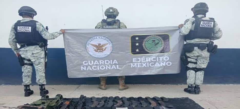 En el lugar, los efectivos decomisaron dos fusiles AK-47, 19 cargadores, 410 cartuchos útiles, equipo táctico y una camioneta Frontier color gris, con reporte de robo.