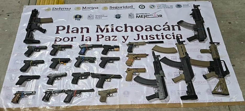 Resultado del operativo interestatal y del reforzamiento a las acciones para la disuasión del delito entre Michoacán y Guanajuato, en la zona limítrofe entre ambas entidades se realizó el aseguramiento de un hombre y un menor de edad en posesión de 24 armas de fuego.